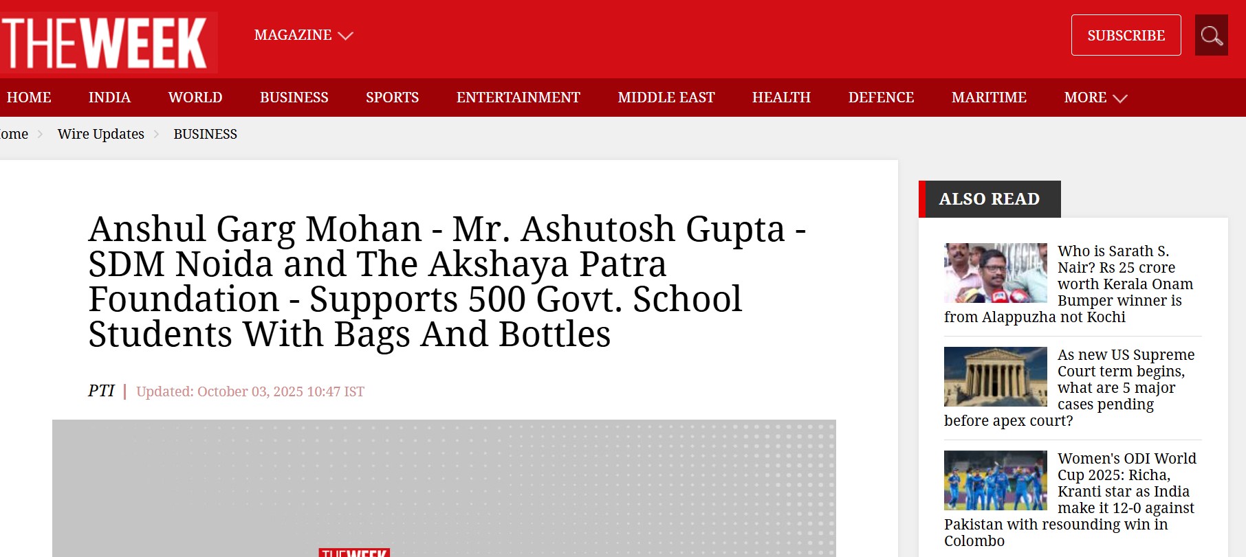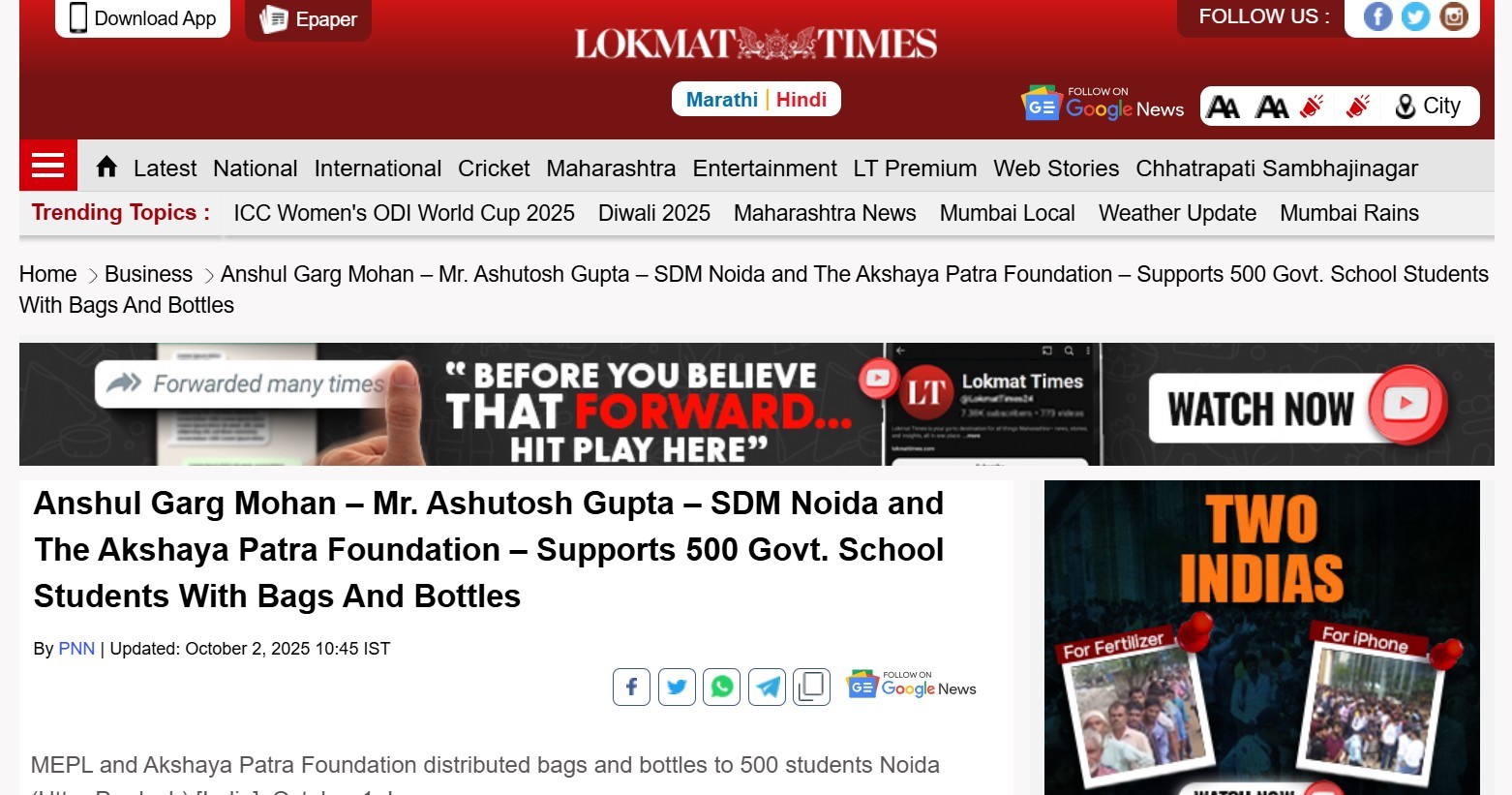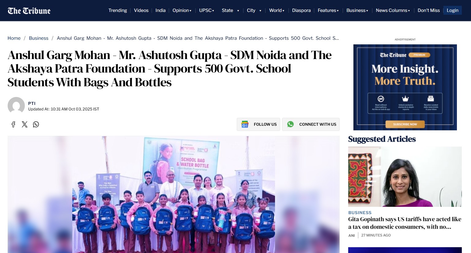 Anshul Garg Mohan – Mr. Ashutosh Gupta – SDM Noida and The Akshaya Patra Foundation – Supports 500 Govt. School Students With Bags And Bottles